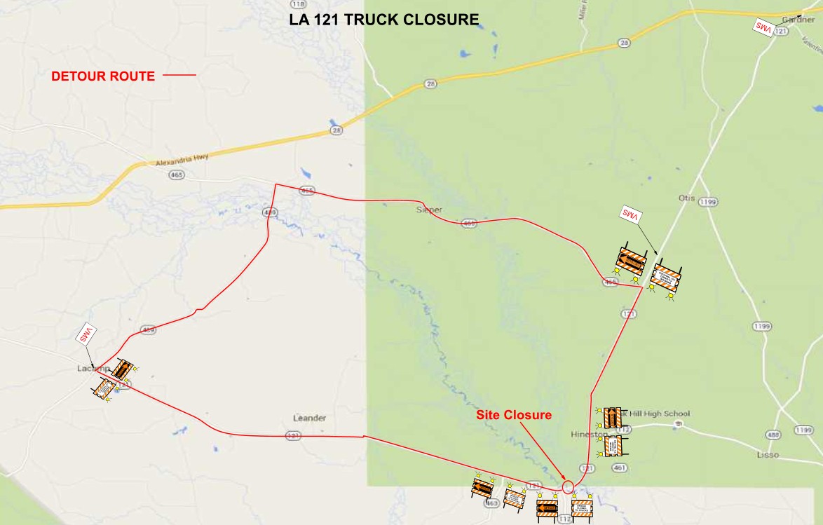 Permit/Detour Section Northbound traffic on LA 121 will detour North on LA 489, then North on LA 465, back to LA 121.