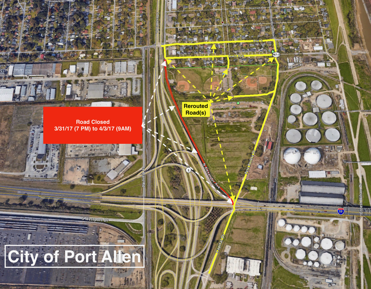Beginning Friday, March 31, 2017 at 6:00 pm through Monday, April 3, 2017 at 9:00 am, Alexander Ave. (LA 1 Service Road) from Ave G to a point underneath the Mississippi River Bridge, I-10 bridge, will be closed. This closure is needed in order to install a gas line for the City of Port Allen.