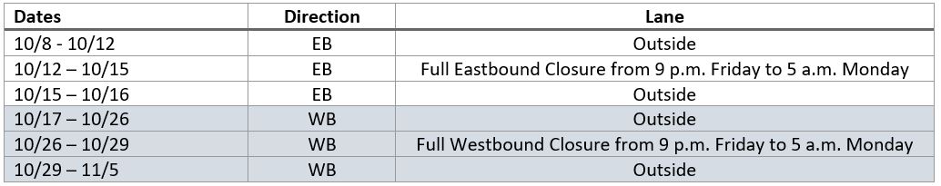 The below chart shows the pattern for lane closures. The full closures will occur on weekends to minimize impact. The I-10 closures will not coincide with the I-210 Prien Lake Bridge closures.