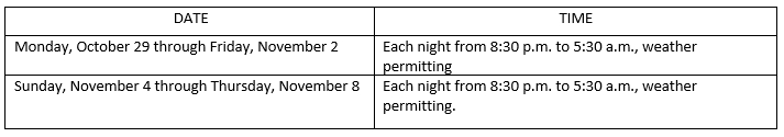 UPDATE: This closure has been extended to the nights of Monday, October 22 and Tuesday, October 23, from 8:30 p.m. to 5:30 a.m. Thank you for your patience.