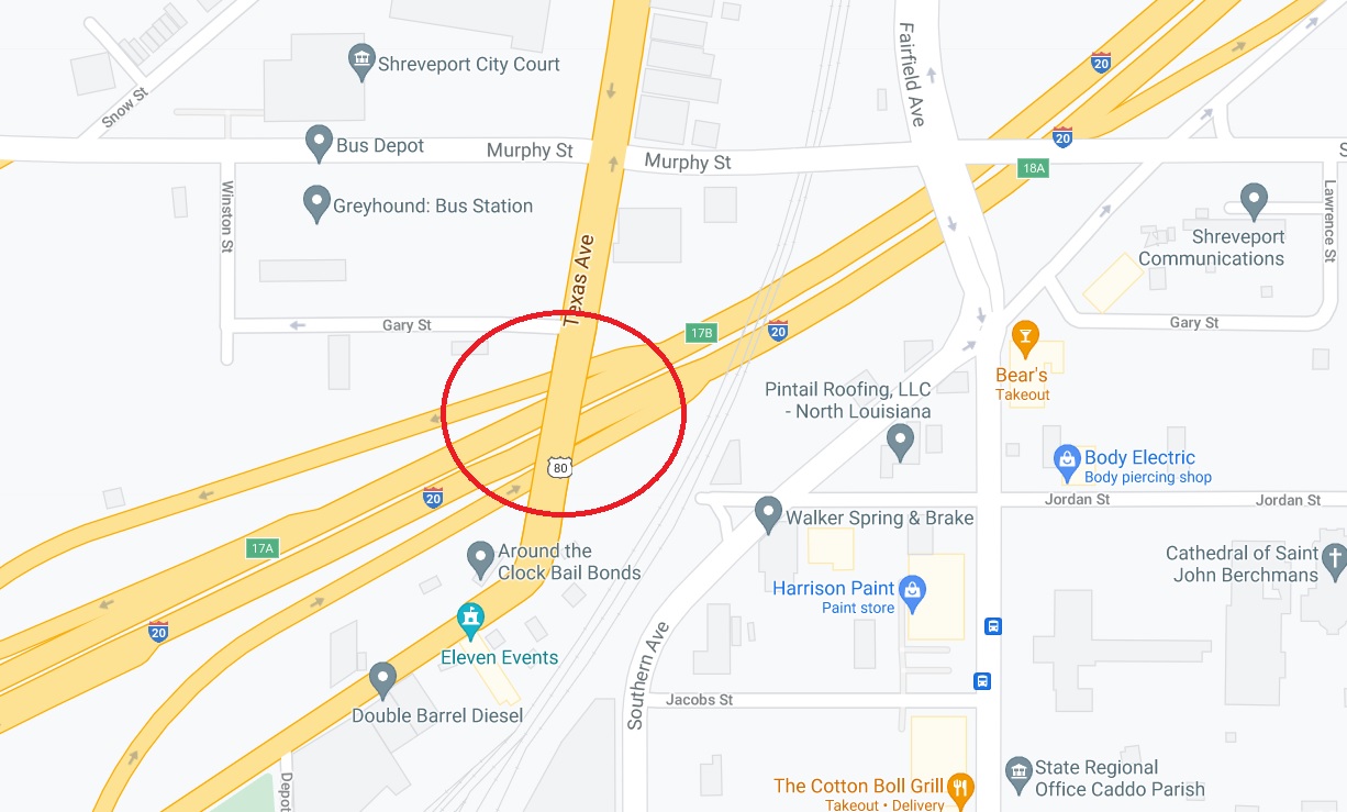 NIGHTLY LANE CLOSURES: US 80 overpass (Texas Ave) at I-20 near Fairfield, Caddo Parish The Louisiana Department of Transportation and Development advises motorists that beginning on Tuesday, June 8, 2021, there will be intermittent nightly lane closures on the US 80 (Texas Avenue) overpass over I-20 just west of Fairfield Avenue in Shreveport, Caddo Parish.