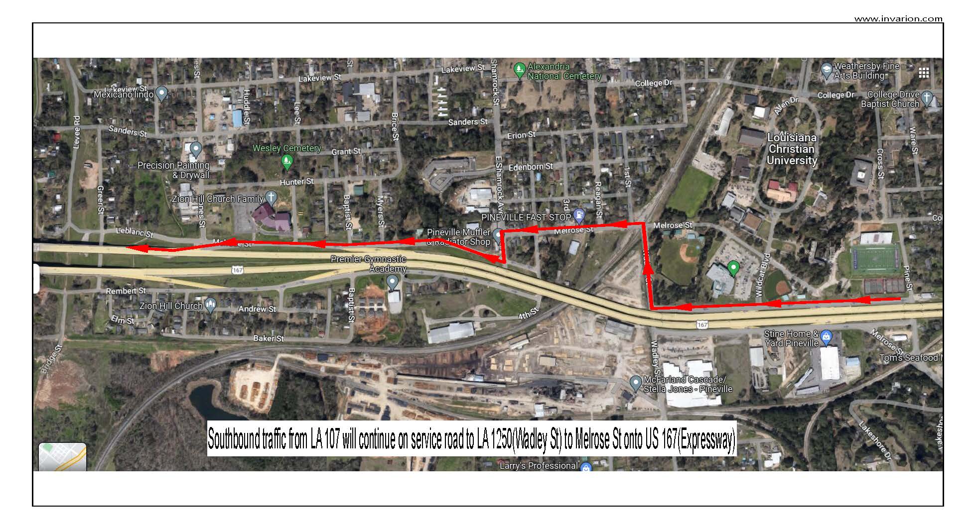 The detour for the entrance ramp from the Service Road (adjacent to LCU) to US – 167 (Pineville Expressway – Southbound) will be for traffic to continue south on the Service Road to LA 1250/Wadley Street to Melrose Street onto US 167. Please see the attached map.