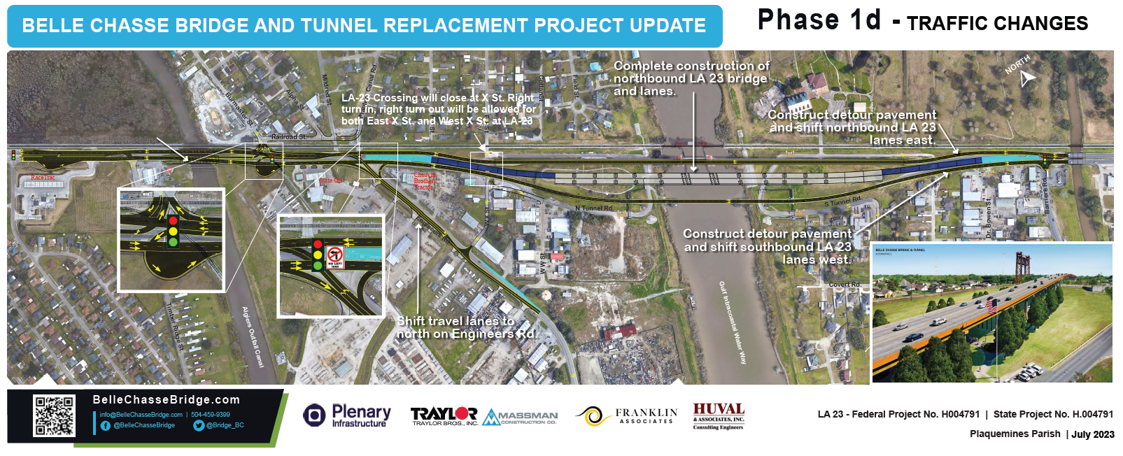The Belle Chasse Bridge and Tunnel Project announces upcoming traffic changes to the LA 23 and Engineer’s Rd. intersection beginning Monday, July 10, 2023, through Friday, July 14, 2023. Motorists traveling northbound on LA 23 will no longer be able to turn left onto Engineer’s Rd. They will pass through the Engineer’s Rd. intersection to the newly constructed Burmaster St. intersection and make a U-turn lane at the Burmaster traffic signal to access Engineer’s Rd. via LA-23 going southbound. Additional traffic changes will occur at the X St. and LA-23 intersection. The LA 23 crossing at X St. will temporarily close to traffic. Motorists will be able to turn right into and out of East X St. and West X St. traffic at LA 23. This traffic condition is temporary and will remain until completion of the new bridge in Spring 2024. During this timeframe, there will be intermittent lane closures. All work is weather permitting. The work is in preparation for the new Belle Chasse Bridge.