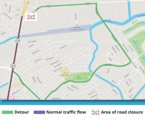 During this work, motorists will be unable to travel through Engineers Rd from southbound LA 23. Motorists wishing to access the closed area of Engineers Rd. will need to utilize the detour, which routes traffic to Lapalco Blvd, through Wall Blvd., and over to Harvey Blvd. LA 23 will maintain normal traffic flow during this work. A map of this detour is provided.