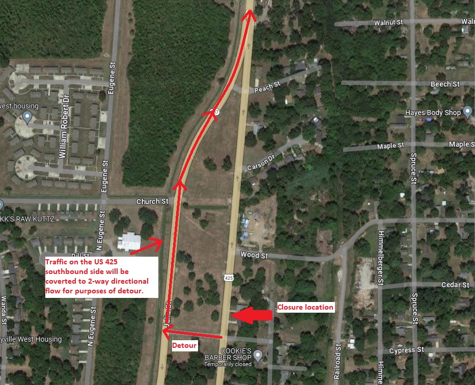 Alternate Route: Vehicles will be detoured west on Hibbler Street, and north on the southbound side of US 425 (Julie St), which will be converted to 2-way traffic for the purposes of the detour. (see included map)