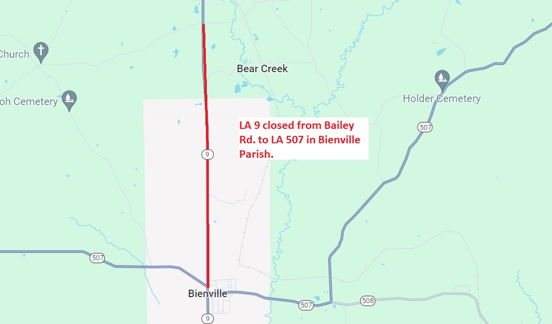 The Louisiana Department of Transportation and Development advises motorists that, effective immediately, a portion of LA 9 in Bienville Parish is closed for the safety of motorists due to a gas well blowout.