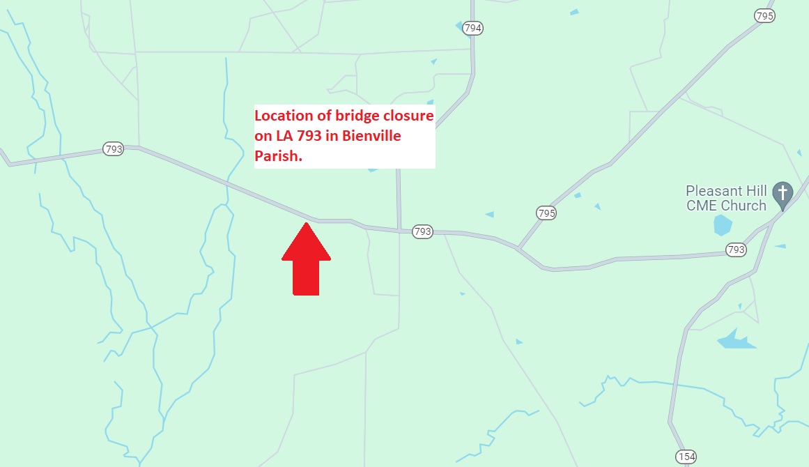 The Louisiana Department of Transportation and Development advises motorists that beginning on Monday, May 20, 2024, the LA 793 over an unnamed waterway in Bienville Parish will be closed.