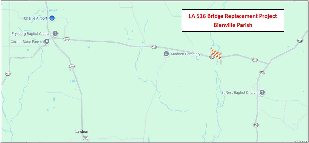 BIENVILLE PARISH – The Louisiana Department of Transportation and Development announces a $2.6 million project to remove and replace the LA 516 bridge over Poland Branch east of Fryeburg in Bienville Parish.