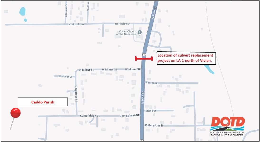 CADDO PARISH – The Louisiana Department of Transportation and Development announces a project to replace a culvert that is located under the roadway of LA 1 near the Town of Vivian in north Caddo Parish.