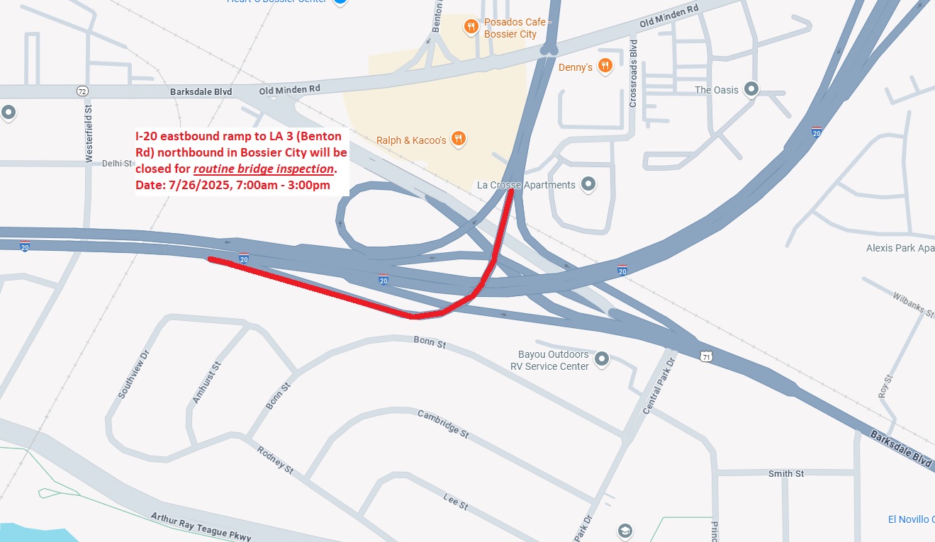 RAMP CLOSURE: I-20 eastbound to LA 3 (Benton Rd) northbound, Bossier Parish The Louisiana Department of Transportation and Development advises motorists that on Saturday, July 26, 2025, the I-20 eastbound to LA 3 (Benton Road) northbound ramp in Bossier City will be closed.