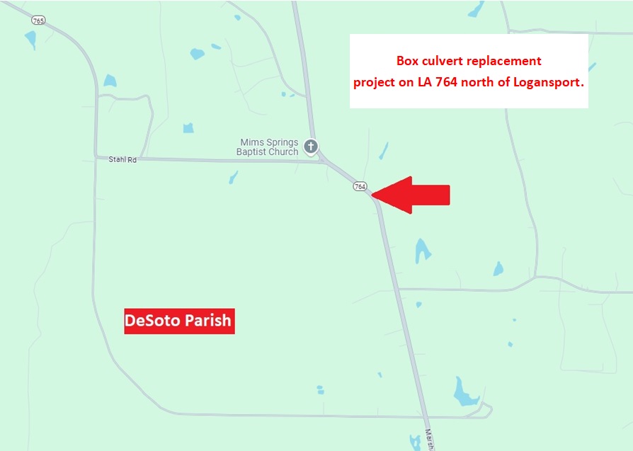 The Louisiana Department of Transportation and Development advises motorists that beginning on Monday, August 4, 2025, work will kick off to replace large box culverts located under the roadway on LA 764 north of Logansport in DeSoto Parish.
