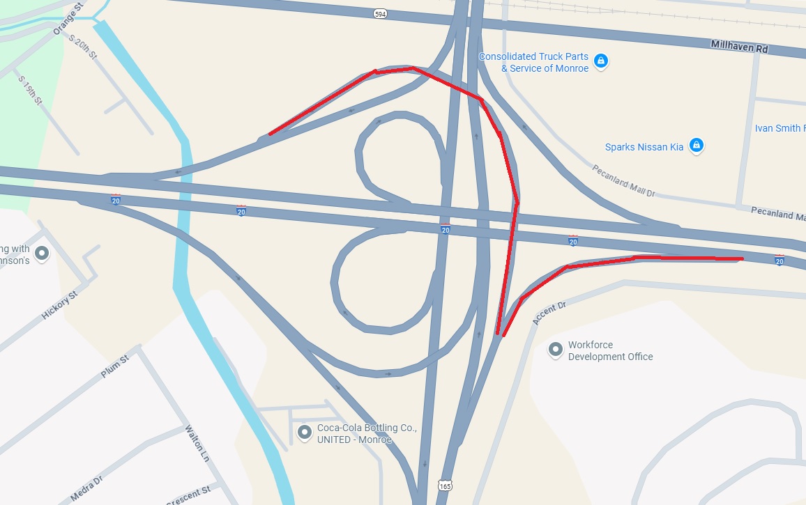 Revised for clarification - The Louisiana Department of Transportation and Development advises motorists that beginning on Tuesday, August 5, 2025, the US 165 northbound on-ramps to I-20 eastbound and westbound in Monroe, Ouachita Parish will be closed.