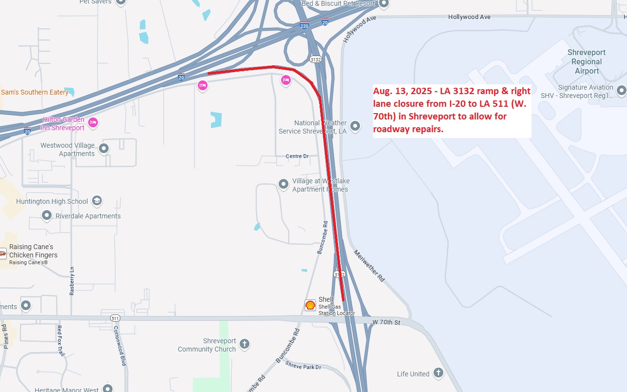 LANE/RAMP CLOSURE: LA 3132 near LA 511 (W. 70th), Caddo Parish The Louisiana Department of Transportation and Development advises motorists that on Wednesday, August 13, 2025, the right (outside) lane of LA 3132 eastbound from I-20 to LA 511 (W. 70th Street) in Shreveport will be closed.