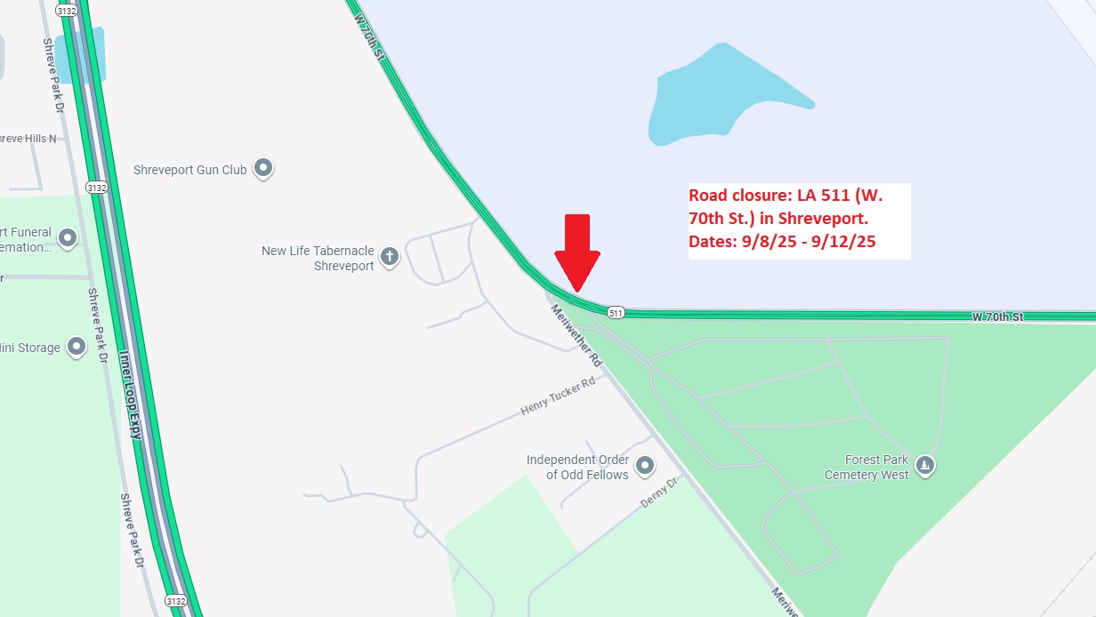 The Louisiana Department of Transportation and Development advises motorists that beginning on Monday, September 8, 2025, a section of LA 511 (W. 70th Street) in Shreveport, Caddo Parish will be closed.