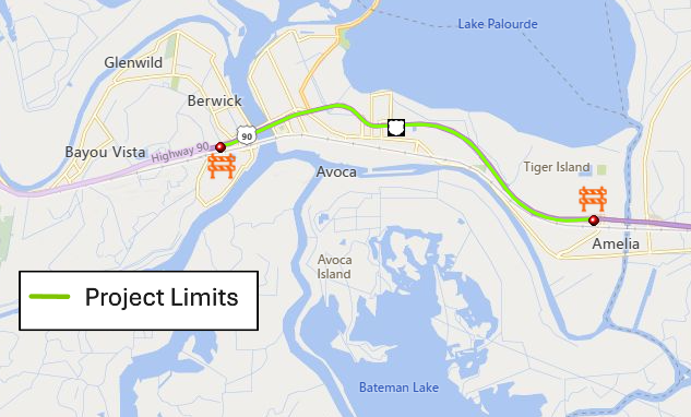 The project will begin west of its interchange with La. 182 in Berwick and end at its interchange with Duhon Blvd. in Amelia.