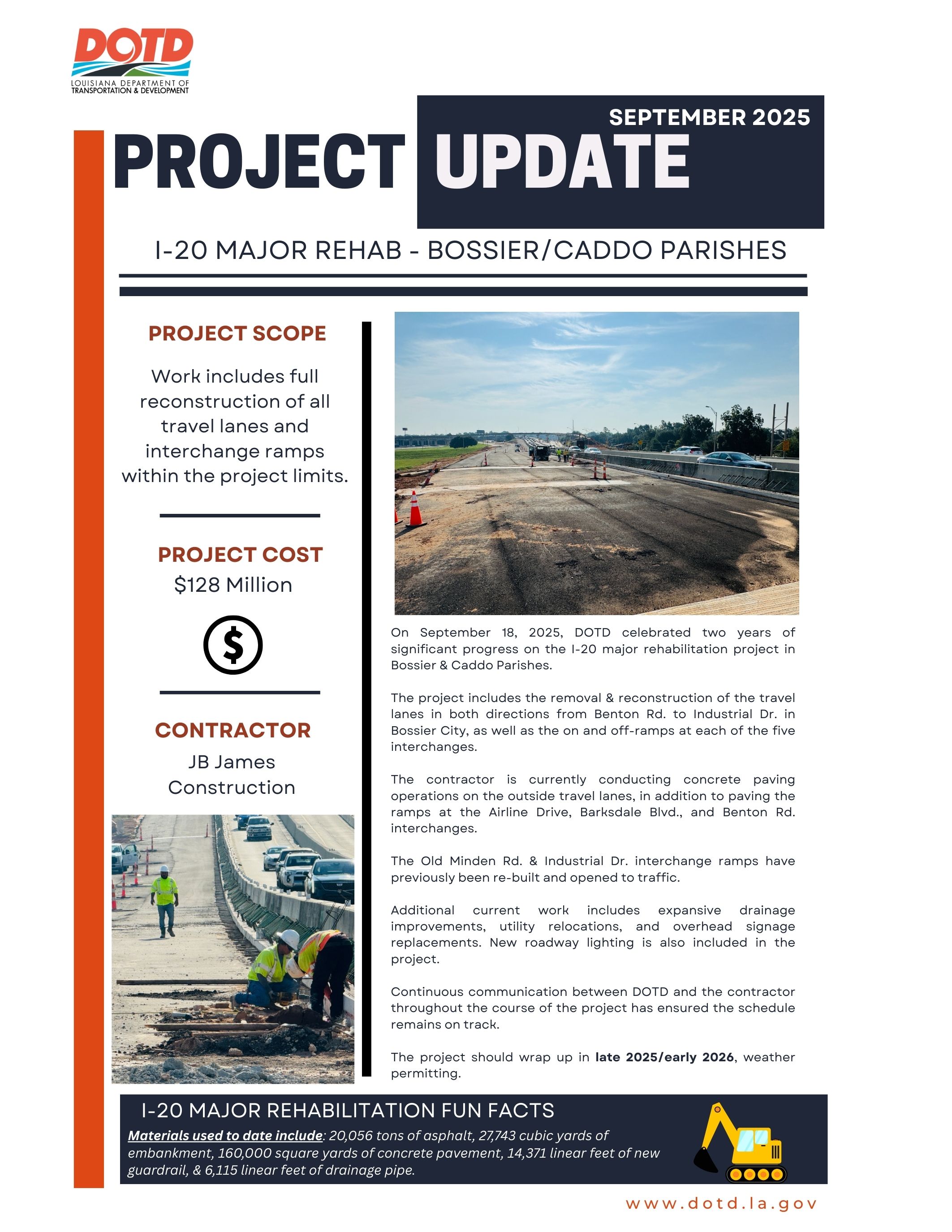 Two years of progress: I-20 major rehab project marks another milestone BOSSIER CITY – Today, the Louisiana Department of Transportation and Development celebrated another significant milestone for the $128 million I-20 major rehabilitation project in Bossier City, officially marking two years of construction as the project marches steadily toward completion.