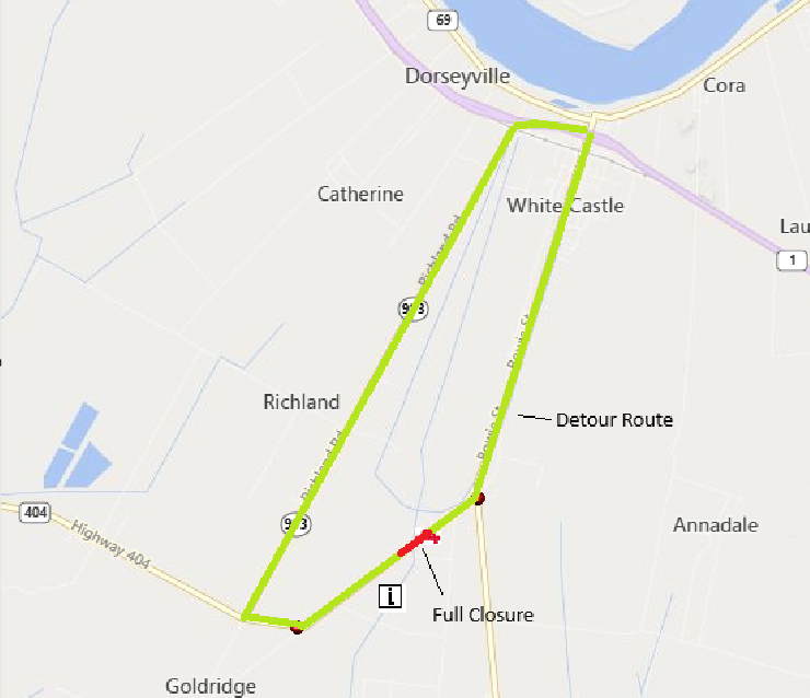 Route Name: LA 404 Eastbound,LA 404 Westbound Start Date: Wednesday, February 18, 2026 at 7:00 AM Estimated End: August 21st, 2026 Closure Type: Roadwork Closure Reason: Bridge Construction Closure Category: Full Closure Start Cross Street: CALLEGAN RD End Cross Street: FIFTY FOOT RD Detour: Motorists can take the following State detour: From LA 404 Eastbound: Motorist traveling LA 404 EB should detour left onto LA 993 NB. Take a right onto LA 1 SB, followed by another right on LA 69 SB. At the intersection of LA 69 and LA 404, take a right onto LA 404 WB to complete the detour. From LA 404 Westbound: On LA 69, bypass LA 404 and travel LA 69 NB towards LA 1. Take a left onto LA 1 NB, followed by another left onto LA 993 SB. At the intersection of LA 993 and LA 404, take a left onto LA 404 to complete the detour.
