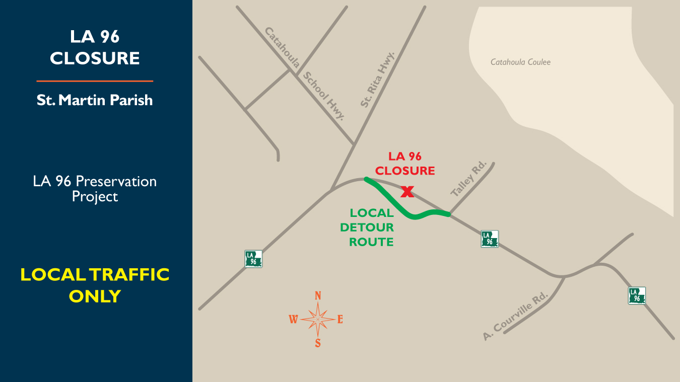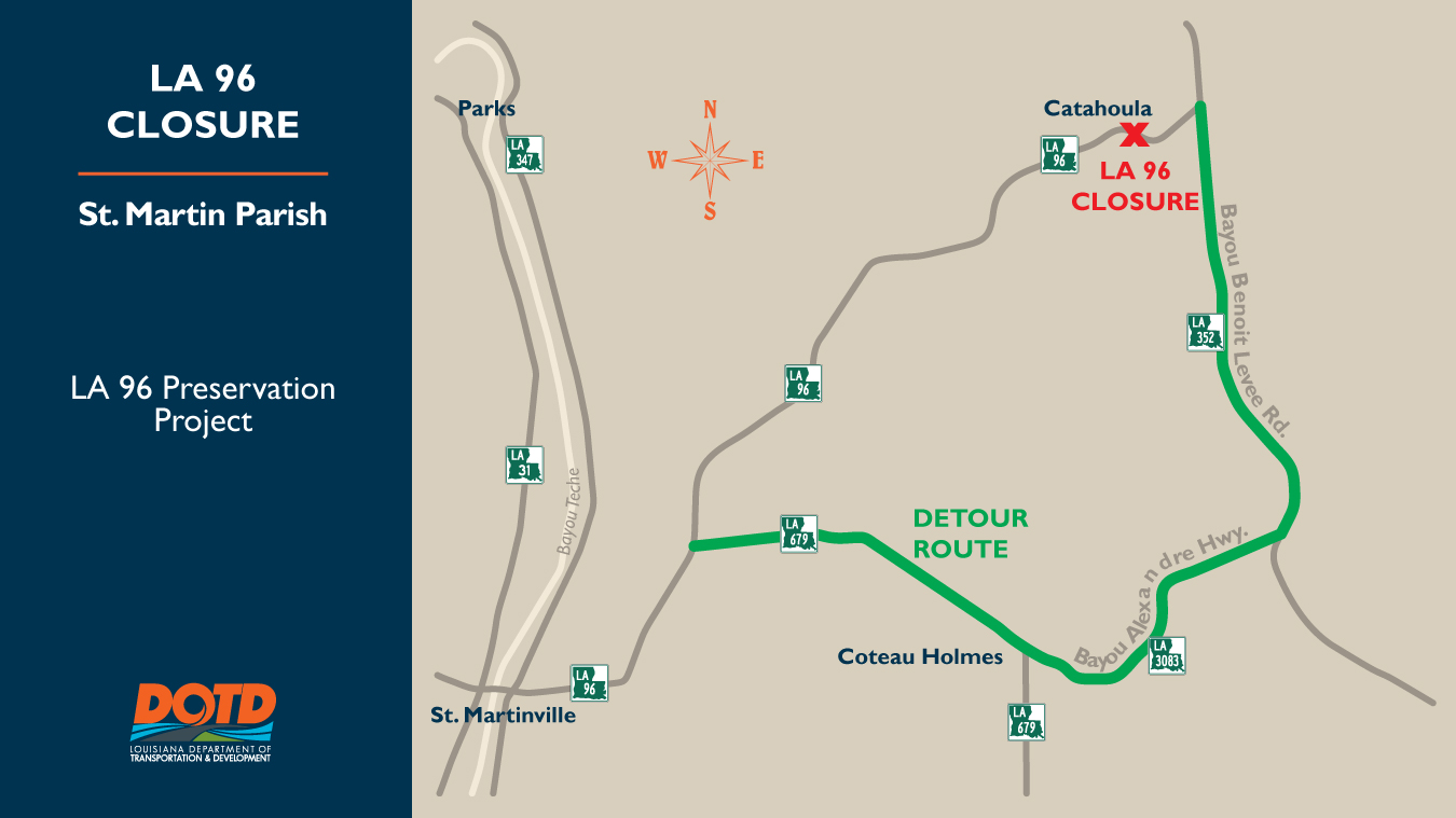 ST. MARTIN PARISH, LA – The Louisiana Department of Transportation and Development (DOTD) announces a scheduled road closure on LA 96 (Catahoula Highway) as part of the ongoing $12 million LA 96 Preservation Project in St. Martin Parish.