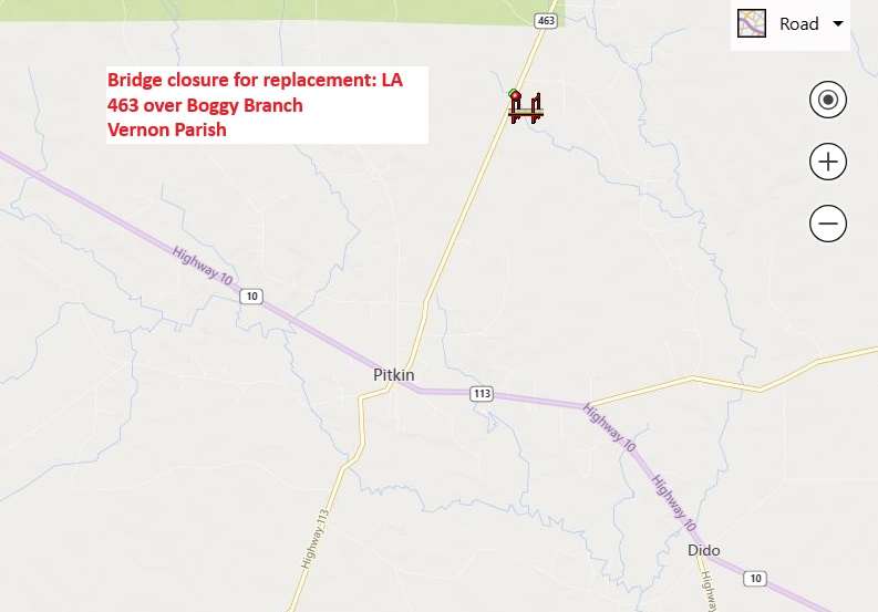 BRIDGE CLOSURE: LA 463 over Boggy Branch, Vernon Parish The Louisiana Department of Transportation and Development advises motorists that beginning on Monday, April 13, 2026, the LA 463 bridge over Boggy Branch north of the Pitkin community in Vernon Parish will be closed for replacement.