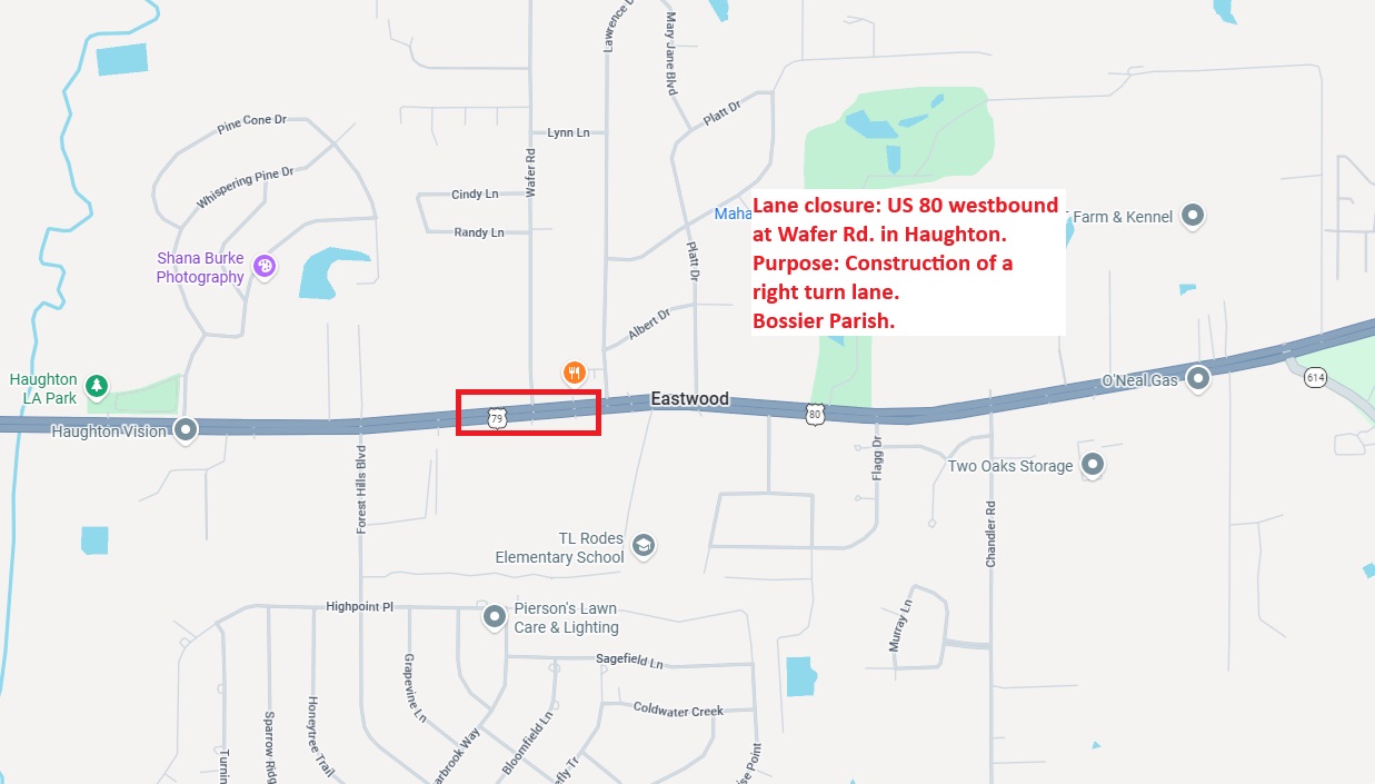 LANE CLOSURE: US 80 westbound at Wafer Rd., Bossier Parish The Louisiana Department of Transportation and Development advises motorists that beginning on Wednesday, April 22, 2026 at 8:00 a.m., the outside (right) westbound lane of US 80 at Wafer Road in Haughton, Bossier Parish will be closed.